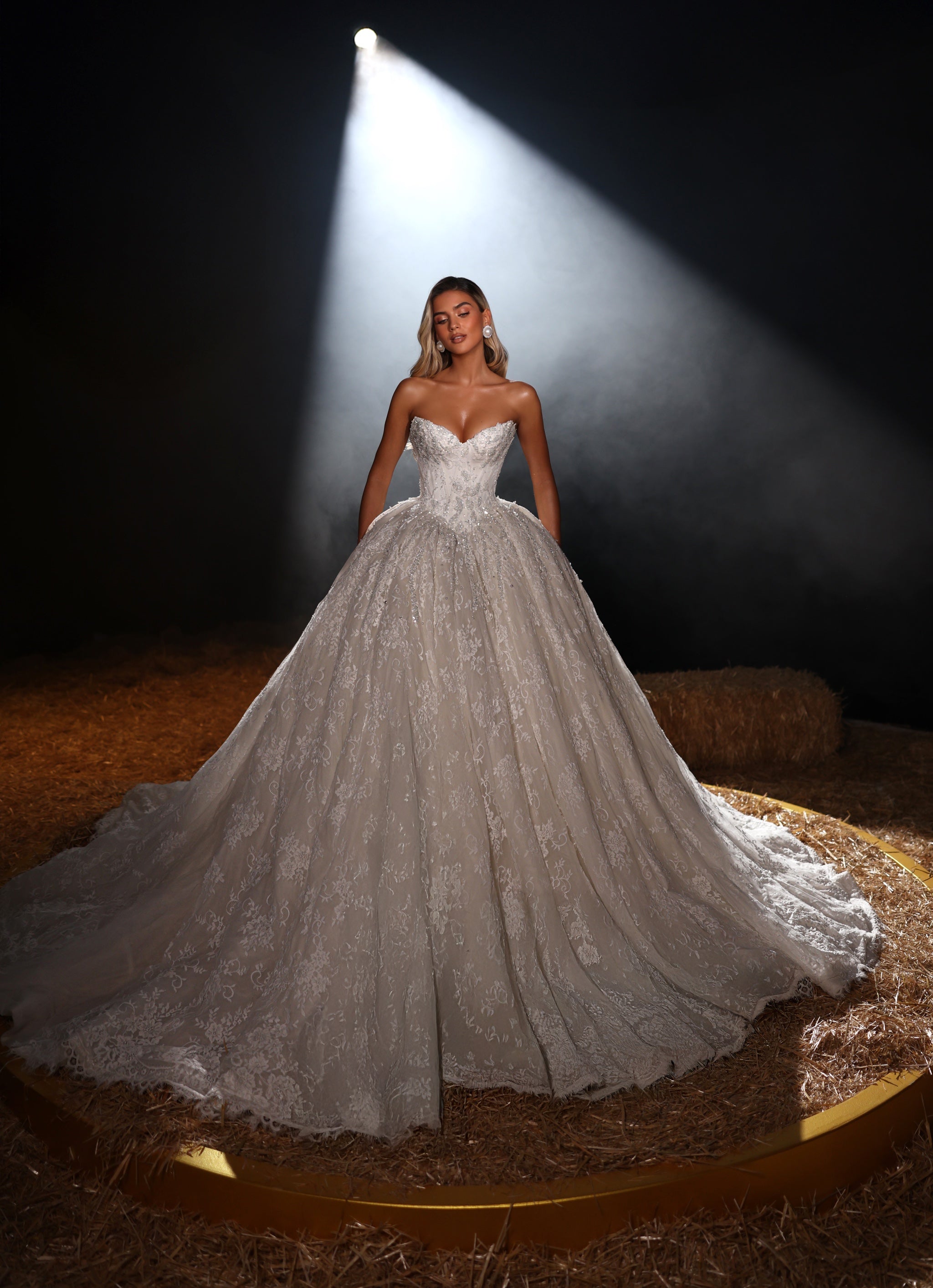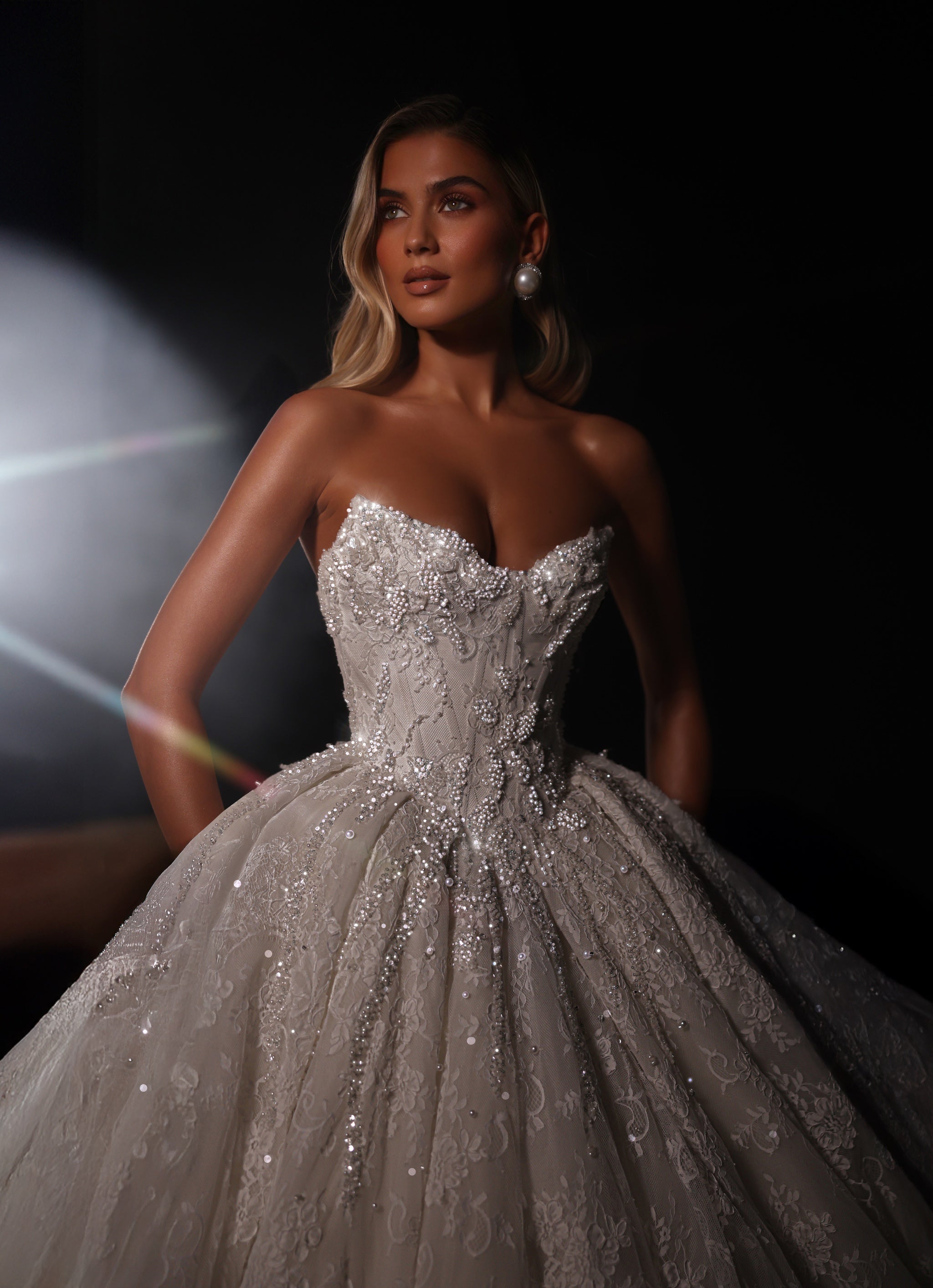 • Full ballgown skirt with generous volume and a sweeping cathedral train