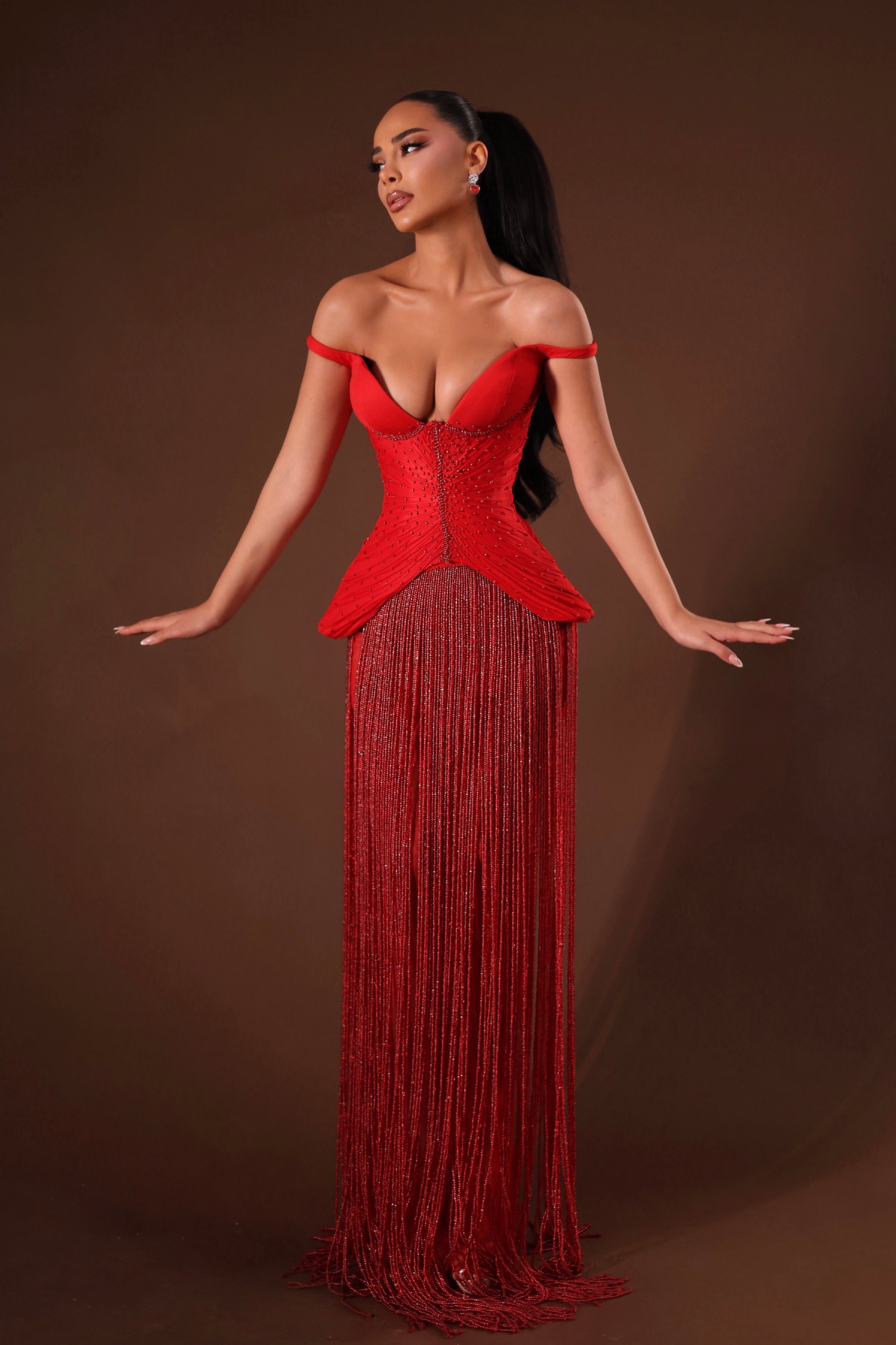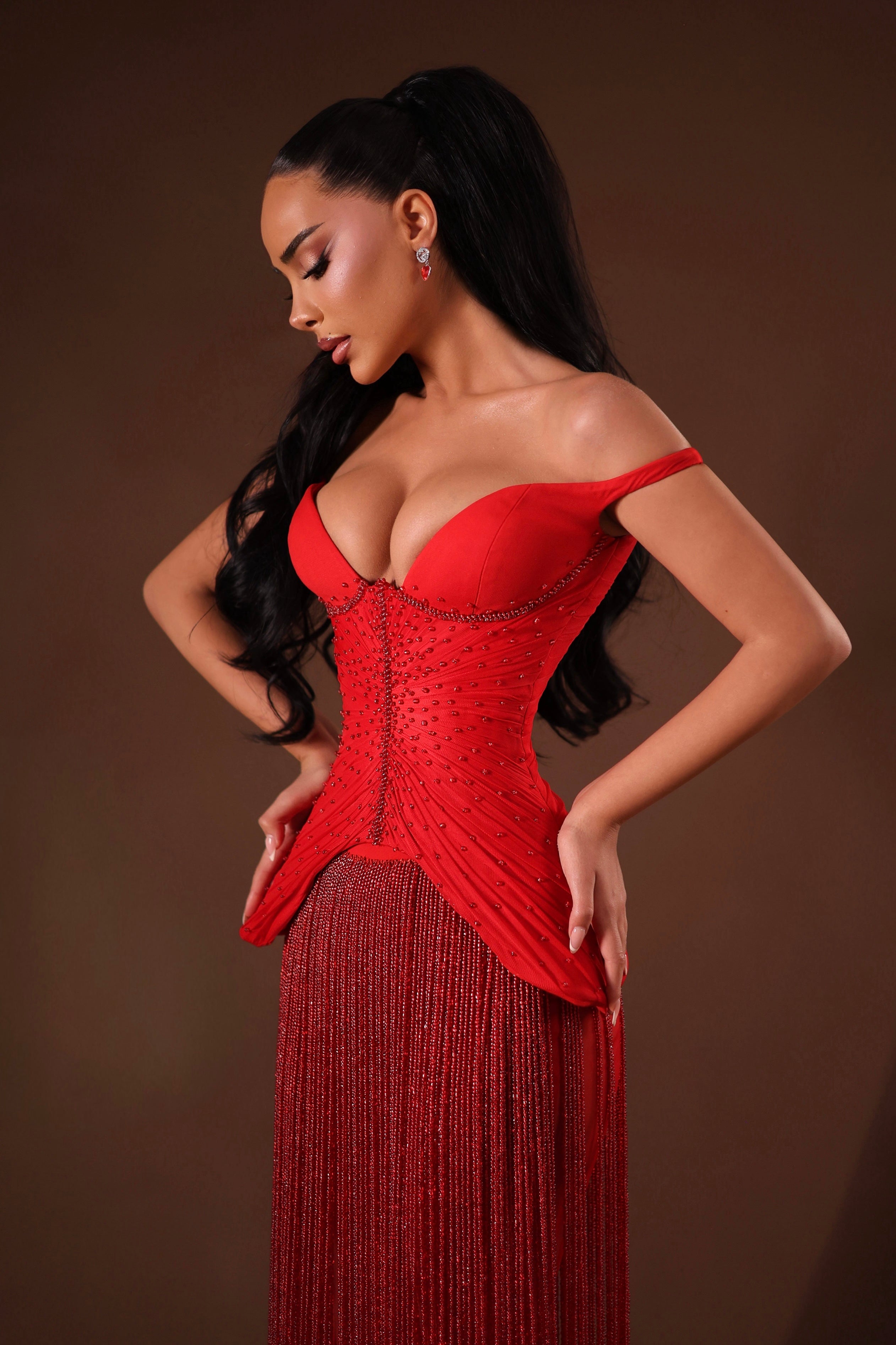 • Sculpted corset-style bodice with structured boning