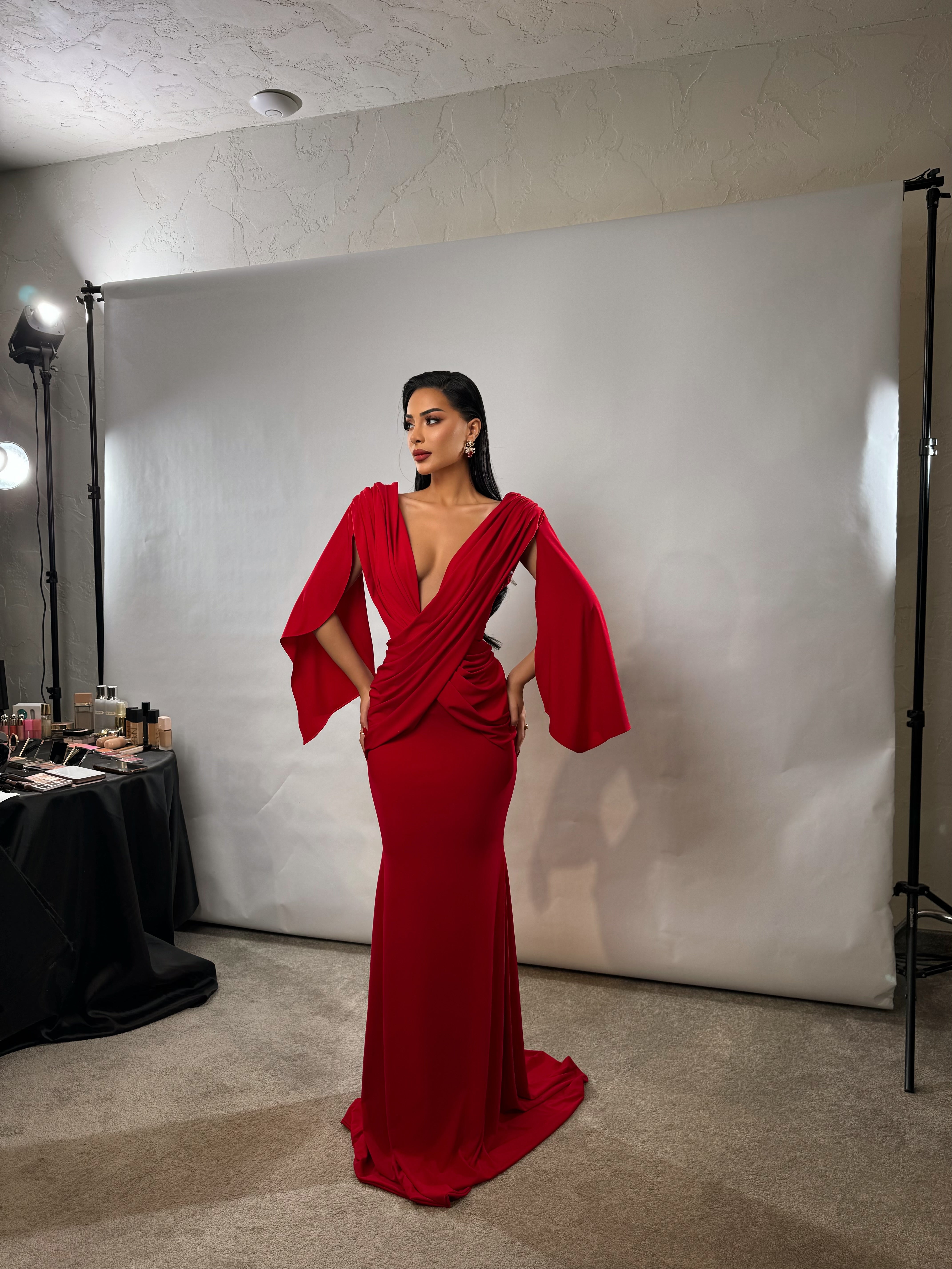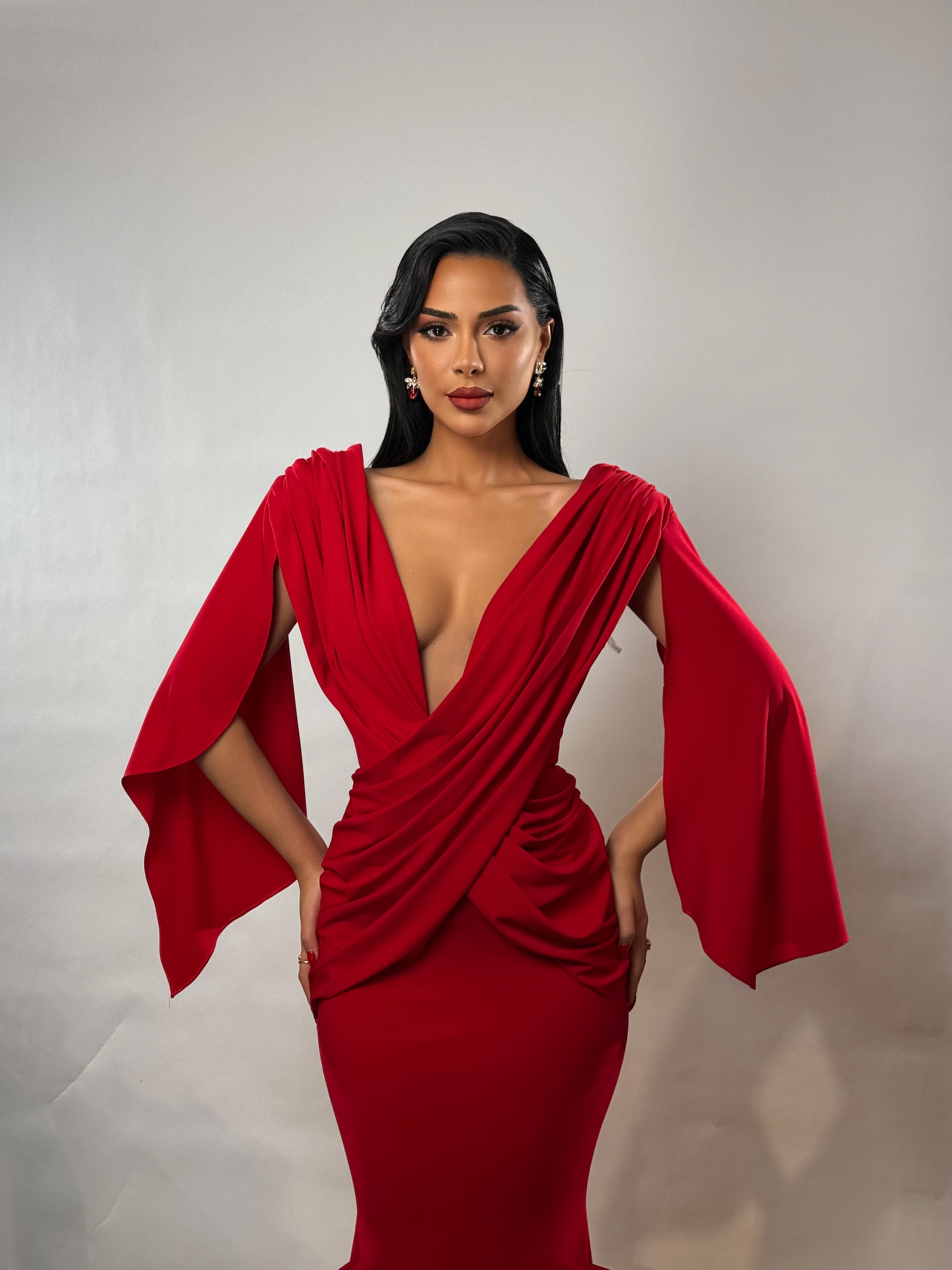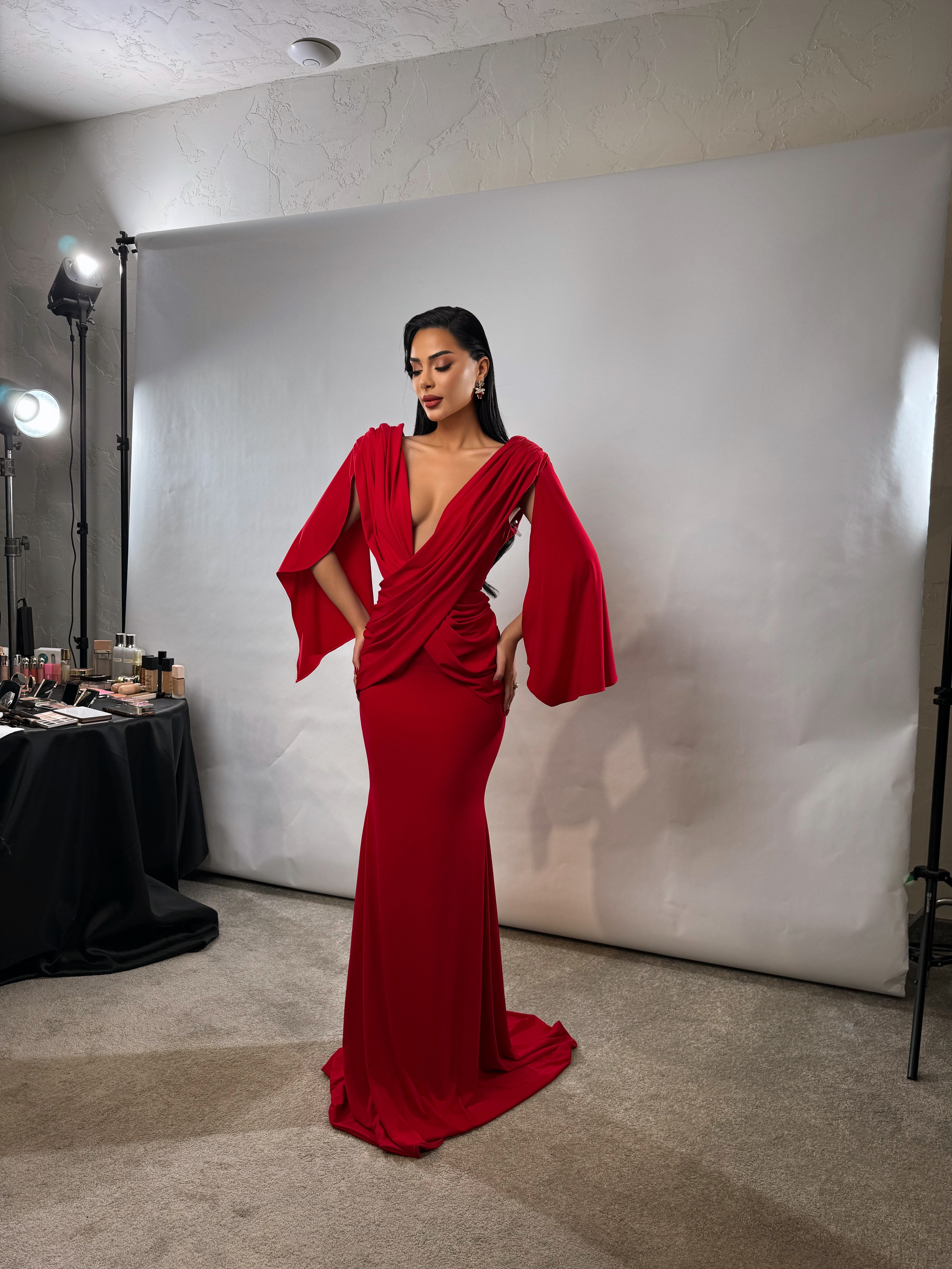 - Statement cape-style sleeves adding dramatic movement and elegance