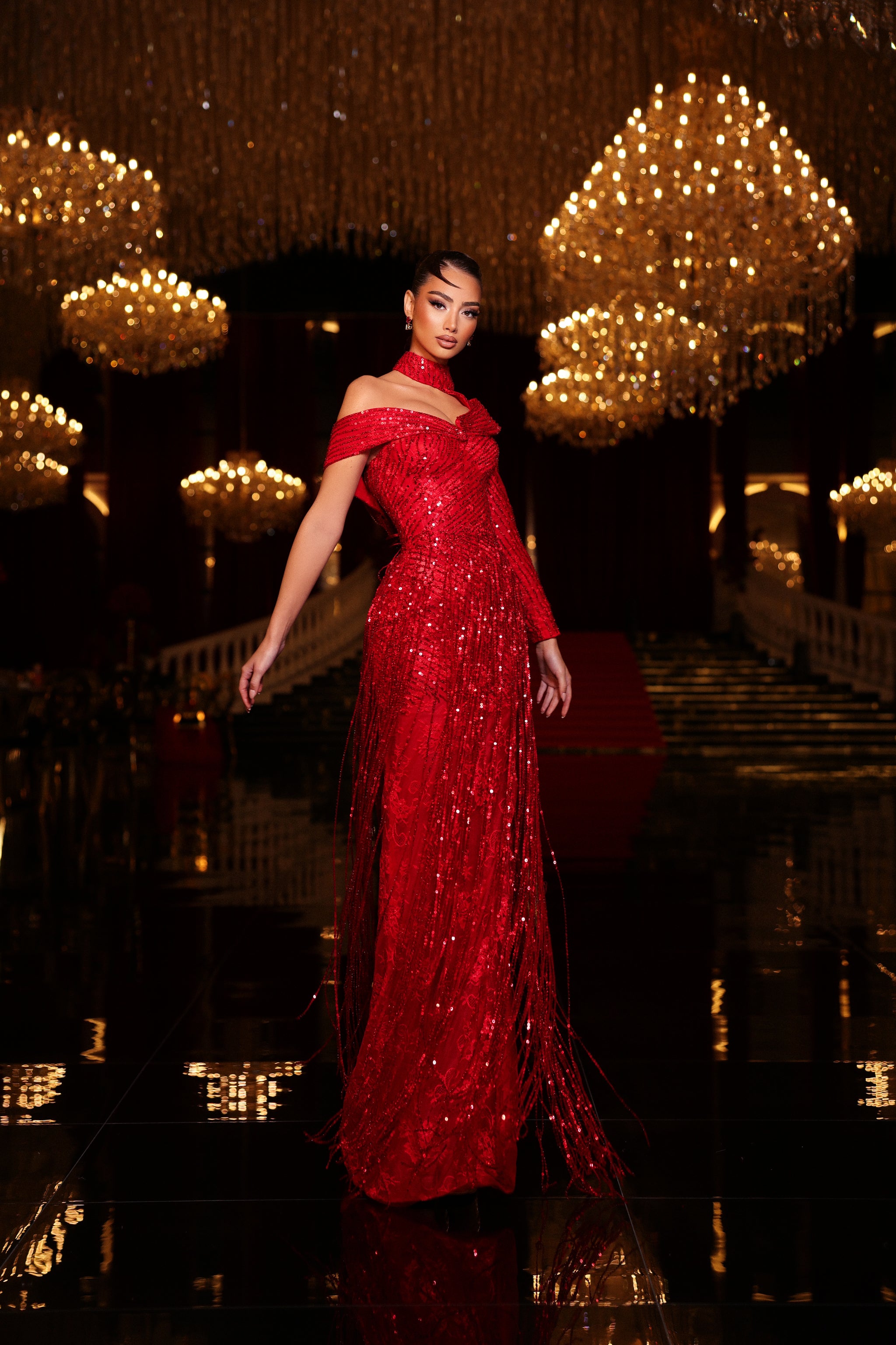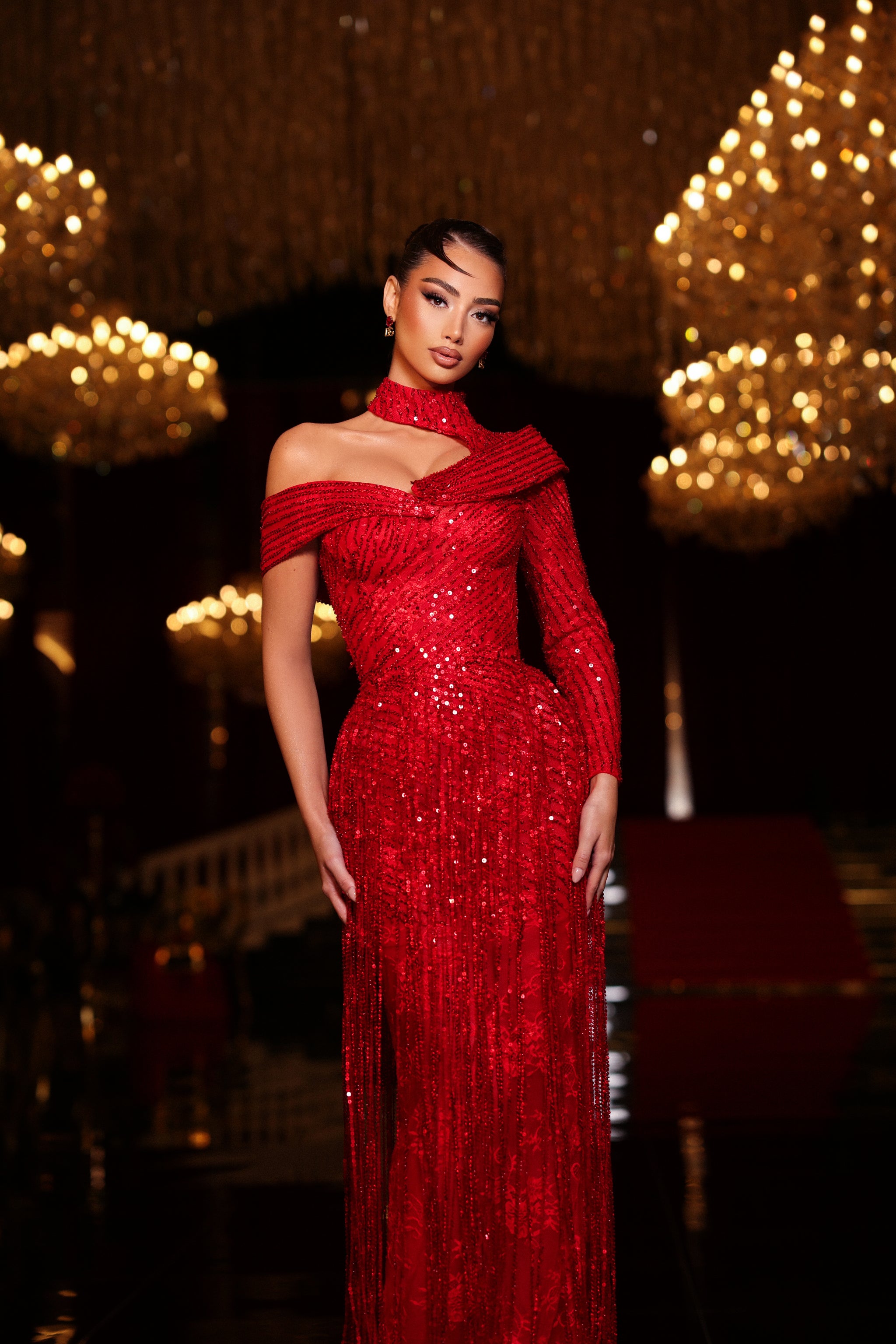 - One shoulder neckline with asymmetrical draped fold over the bust